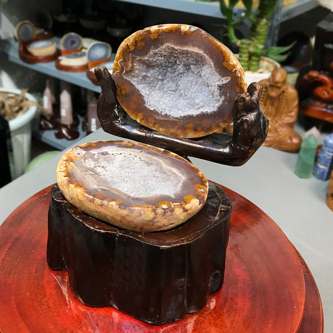 Bát tụ bảo được chọn từ những loại thạch anh thiên nhiên có kết tinh dạng hốc, thận… với tên gọi là agate hay còn gọi tên tiếng Việt là mã não vì có hình giống não của loài ngựa. Mã não thường ở dạng trứng, ổ, hốc, hang bên trong phủ đầy những tinh đám thạch anh long lanh còn gọi là noãn thạch (trứng đá).
