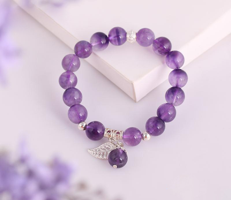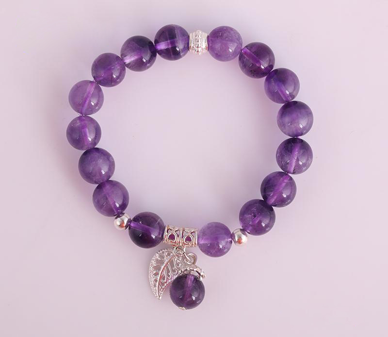 Vòng Tay Đá Thạch Anh Tím 2A 10 Mix Charm Lá Treo Bạc 999 BLT01